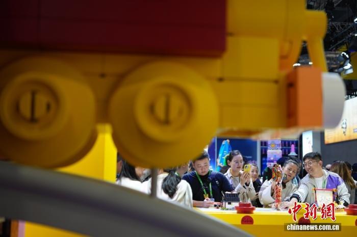 11月6日,上海,第八届中国国际进口博览会消费品展区热闹非凡。图为乐高展台吸引参观者。中新社记者 蒋启明 供图